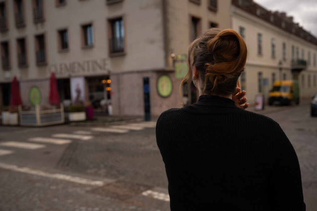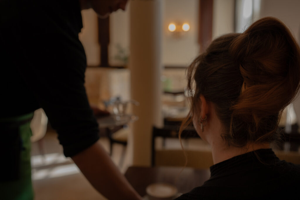 Rather than presenting a single portrait, the series was developed as a short cinematic sequence. Each image represents a small moment within a story, arriving at the café, waiting at the table, a quiet interaction with the waiter, and a reflective moment by the window.